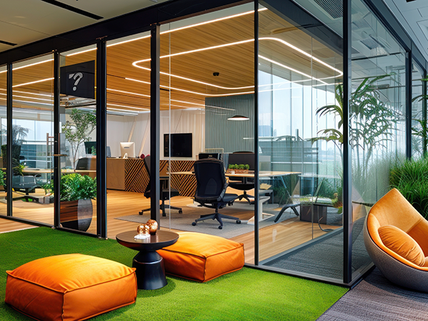 また、人工芝は来客スペース、会議スペース、ストレッチスペースなど一部にだけ設置もできます。
