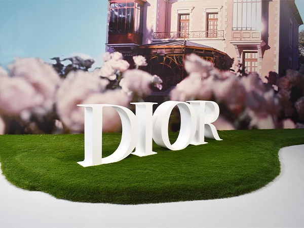 こちらは高級ファッションブランドの新作発表イベントでリアリーターフ®︎を使用した事例で、洗練された装飾が印象的です。鮮やかな緑の人工芝の上に配置された大きな白いブランドロゴが、存在感を際立たせています。背景の建物や花々と調和しつつ、優雅さと自然さを巧みに演出しており、ブランドの世界観を効果的に表現しています。