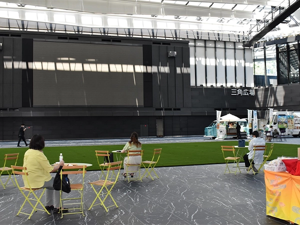 人工芝の活用方法はもちろん装飾だけではありません。こちらは、パブリックビューイングイベントの会場にリアリーターフ®︎を設置した事例です。広々とした屋内空間に、大型スクリーンが設置されており、迫力ある映像体験を提供できるよう準備されています。中央には人工芝が敷かれ、屋外のような開放感を演出しています。人工芝があることで、寝転がりながらリラックスして観戦できたという方もいたようです。