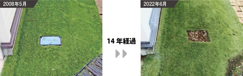 人工芝に使われる素材によっても大きく左右されるのですが、リアリーターフ®︎の場合、屋外使用で10年前後の耐用年数を想定しています。下の写真はリアリーターフ®︎を実際に14年間使用した際の状態を比較したものです。リアリーターフ®︎は、UVカット加工が施されているため、14年経過したあとも綺麗な色合いが続いています。