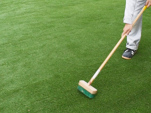人工芝の上を歩いたり物を置いたりすると、重みでパイルが寝てしまいます。放置すると見た目が悪くなるだけでなくクッション性の低下にもつながるため、定期的なブラッシングが欠かせません。