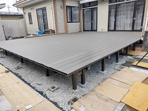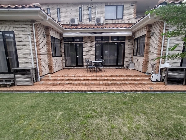 近年、外構工事ではウッドデッキと人工芝を組み合わせるケースが多く、一般的にはウッドデッキの周囲に人工芝を敷設しますが、今回はウッドデッキの上へ人工芝を敷設するという、あまり例のない施工でしたのでその経緯をご紹介いたします。