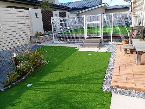 そこで、上述した環境を考慮し、外構設計・工事会社から天然芝ではなく、人工芝への張り替えの提案がされました。ご提案をされる上で、今回ポイントとなったのは施主様の生活環境の変化でした。ご自宅を新築された当時、施主様はペットを飼っていらっしゃらなかったのですが、その後愛犬を2匹飼われ始め、愛犬と一緒に過ごせるお庭環境が欲しいとのご要望でした。
