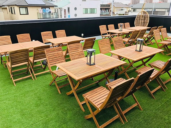 人工芝が緑色であることで置いてあるテーブルや椅子など、オシャレな非日常空間を演出し、リラックスしながら楽しく屋外で食事ができる空間ができているのが分かるかと思います。