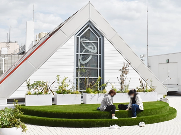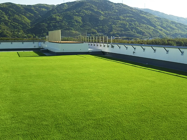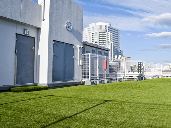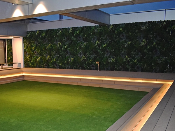 屋上緑化として、弊社グリーンフィールドの高品質・高機能人工芝「リアリーターフ®」と人工壁面緑化パネル「ビスタフォリア®」を設置した実際の事例を紹介します。