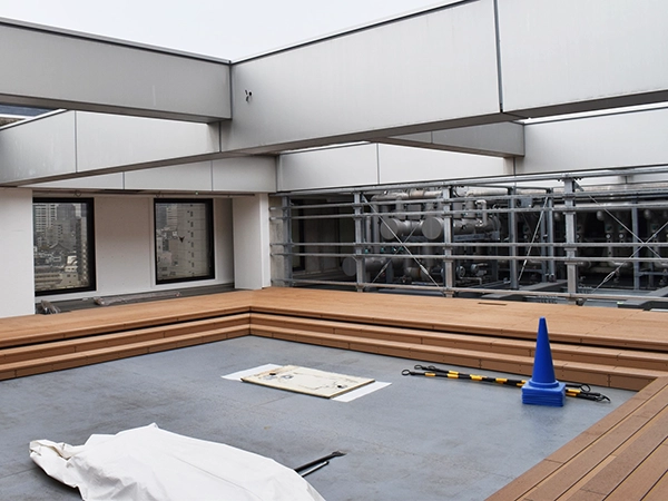 次の写真は、人工芝「リアリーターフ®」と人工壁面緑化パネル「ビスタフォリア®」を設置した屋上の施工前と施工後を比較したものです。奥には空調機器などの機械類が見えており無機質な空間となっていましたが、「ビスタフォリア®」を使用することで、その雰囲気が一変しました。