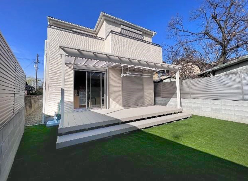 いかがでしょうか。施工後の写真のように、掃き出し窓から出ると広いデッキがあり、そこから美しいグリーンの庭をゆっくり眺めて寛ぐ事ができます。人工芝のため、メンテナンスの手間も少なく、また夏場に庭で水遊びをしても、泥が体に跳ね返ってくる心配もありません。
